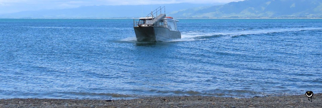 Die Maori Familie Barrett verantwortet den sanften Tourismus auf der Insel. Unser Reiseveranstalter hatte uns für einen der begehrten Aufenthalte vorab gebucht und als wir morgens zum Büro von Kapiti Island Nature Tours kamen, wurden wir herzlich in Empfang genommen und mit den notwendigen Informationen versorgt. Wir konnten unser schweres Gepäck im Büro abgeben. Unser Campercar hatten wir kostenfrei auf einem nahegelegenen Parkplatz abstellen können. Mit unseren Tagesrucksäcken, die das Nötige für zwei Übernachtungen und unsere Ferngläser/Kamera enthielten, ging es dann weiter zum Check In, wo wir nochmals alles auf mögliche unliebsame Mitreisende untersuchten, um nicht versehentlich irgendwelche Schädlinge auf die Insel mitzuschleppen. Wir und die Schüler, die mit ihrer Klasse einen Tagesausflug auf die Insel unternahmen, bekamen alle noch ein leckeres Lunchpaket mit selbstgebackenen Muffins und frischen Wraps und liefen hinüber zum Strand. Hier startete die Reise zur Insel bei gutem Wetter und sanftem Wellengang,