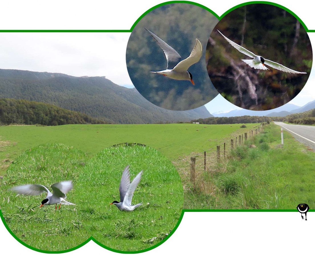 Weiter oben an der Milford Road bogen wir in eine kleine Parkbucht ein. Von hier aus hatten wir einen guten Ausblick und Einblick auf den Eglinton River. Hier jagten etliche Schwarzstirn-Seeschwalben über dem Fluss.Interessant ist auch, dass die Schwarzstirn-Seeschwalben Chlidonias albostriatus (Black fronted tern) zur selben Gattung gehört, wie unsere eurasischen Sumpfseeschwalben (Trauer-, Weißflügel- und Weißbartseeschwalbe; Chlidonias niger, Chlidonias leucopterus, Chlidonias hybrida).