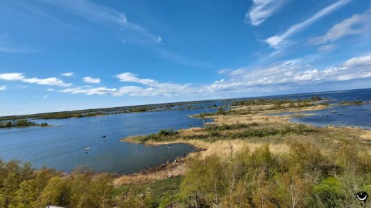 Wir folgten den Wegweisern ins Naturschutzgebiet und wurden dann auch von den Kranichen im Überflug quasi begrüßt. Sie überflogen eine Wasserfläche mit zahlreichen Felsen und kleinen Inselchen.