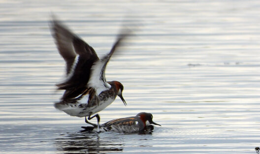 Bei den Odinshühnchen brütet das unscheinbarere Männchen ( im Bild oben ) und zieht die Jungen auf. Das Weibchen ist prächtiger gefärbt.