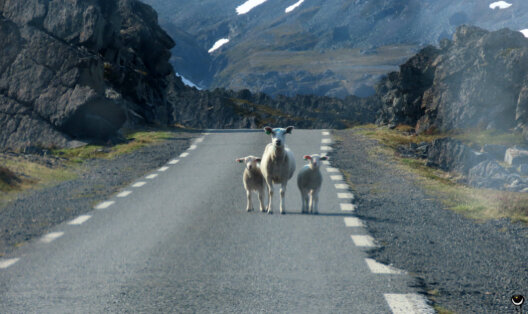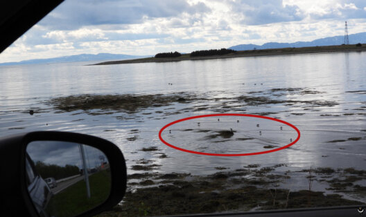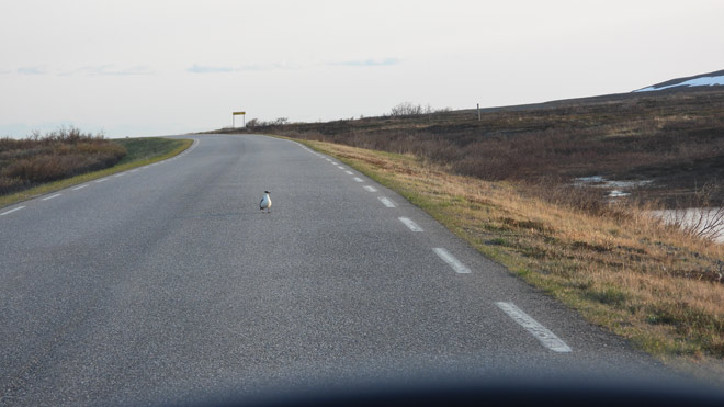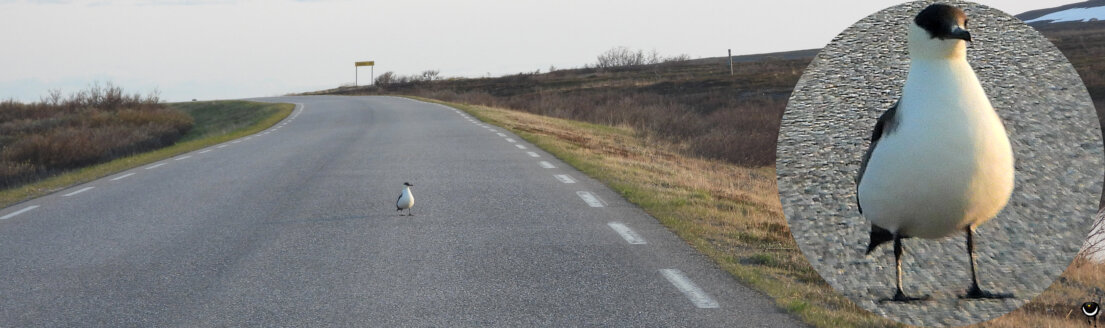 Der kleine weiße Punkt auf der Fahrbahn ist eine Raubmöwe. Die helle Morphe der Schmarotzerraubmöwe. Im Rückspiegel wäre eine weitere Schmarotzerraubmöwe, die dunkle Variante zu sehen gewesen. Sie hatte sich hinter dem Auto positioniert. Welches planvolle Verhalten dahinter stand, wissen wir nicht.