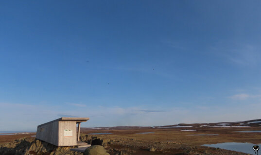 die überdachte Aussichtsplattform mit Blick in die Tundralandschaft mit ihren