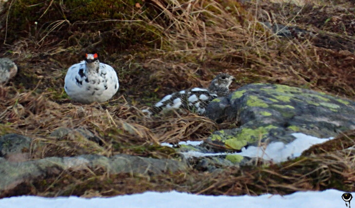 ♀ rechts im Bild , die Alpenschneehenne ist besonders optisch mit ihrer Umgebung „verschmolzen“, der Hahn wäre sicher im Schnee fast unauffällig.