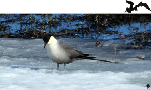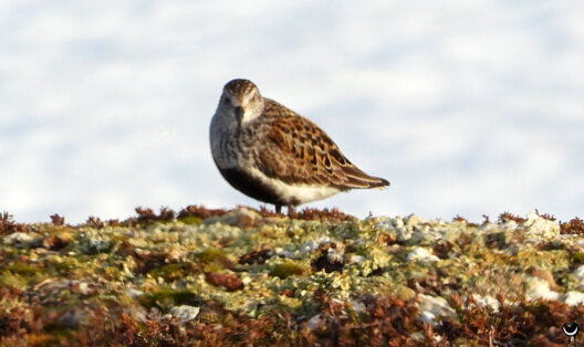 Wo es zu tauen begann, zogen die kleinen Oasen der Vegetation Kleinvögel an. Wir beobachteten einen Temminckstrandläufer bei der Balz, entdeckten den Wiesenpieper in einem Busch. Und endlich auch eine Falkenraubmöwe, die farblich gut an den Schnee angepasst war.