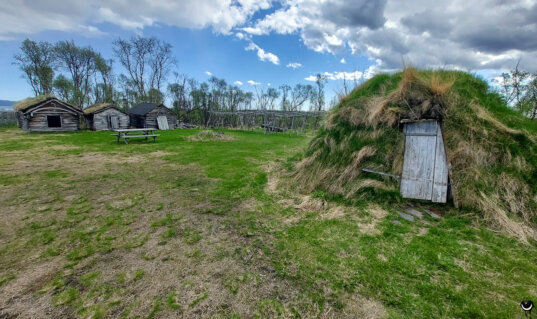 Erdhütten im Freilichtmuseum Varangerbotn. Soviel sei schon verraten: Das war nicht unser Quartier für die Folgetage. Es hätte auch nicht ins Museumskonzept gepasst. Zwei Touris mit Gaskocher, die in bunten Schlafsäcken nächtigen.