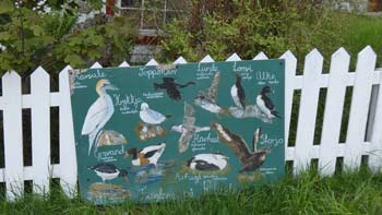 Nachdem wir uns eingerichtet hatten, zog es uns zu den Vogelfelsen, auch da der Regen sich gelichtet und der Himmel aufgeklart hatte. Es tat uns gut, wieder in Bewegung zu kommen und in Bewegung zu sein. Wer gerne bergwandert, ist auf Runde gut aufgehoben, da alle Wege irgendwie nach oben führen, teilweise mit hochprozentiger Steigung. Wir passierten die Glashäuser der Gärtnerei, bogen von der Küstenstraße nach links auf den kleinen Wanderweg ab, kleine selbstgemalte Infotafeln an einem Gartenzaun informierten über die Vogelwelt und die Pflanzen, das bot eine kleine Pause vor dem Anstieg.